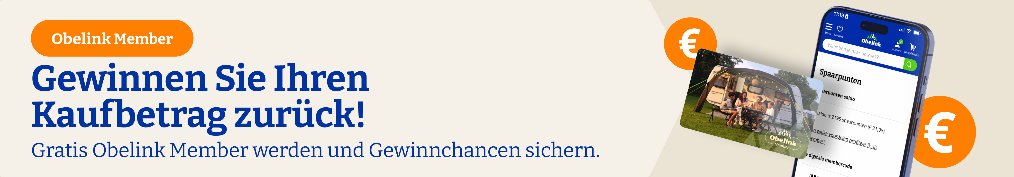 - Nur Produkte, die im Zeitraum vom 1. Oktober 2025 bis zum 31. Dezember 2025 über obelink.de oder in unserem Megastore in Winterswijk mit einer registrierten Membercard oder einem registrierten Membercode gekauft wurden, nehmen an der Verlosung teil. Membercard oder - Code und Newsletter-Abonnement müssen unter derselben E-Mail-Adresse registriert sein.