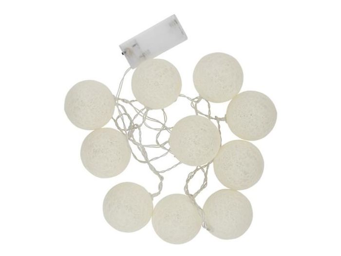 Hängen Sie die Lichterkette auf oder platzieren Sie sie in einer Schale, um eine gemütliche Atmosphäre zu schaffen. Diese Lichterkette besteht aus 10 Leuchtkugeln aus Baumwolle in einer weißen Farbe. Die Kugeln haben einen Durchmesser von 6 cm und enthalten eine LED-Lampe.