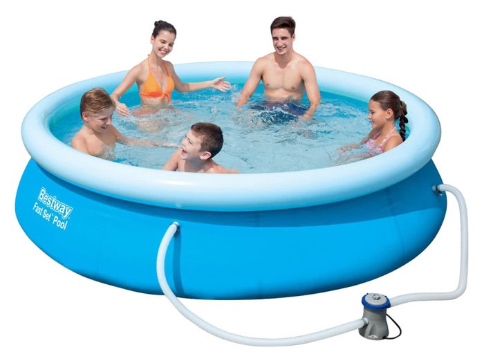 Der Bestway Fast Set Pool kann in kürzester Zeit aufgebaut werden. Die mitgelieferte Filterpumpe sorgt für klares und hygienisches Wasser. Dank der aufblasbaren Kante des Pools hat er immer die richtige Form und Stabilität.
