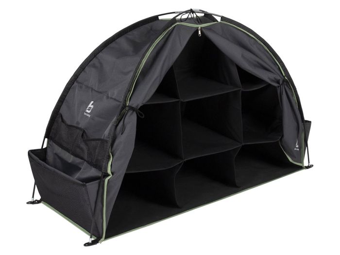 Der Bo-Camp Bogenschrank ist mit mehreren Fächern ausgestattet, die einfach mit einem Reißverschluss zu schließen sind. An der Seite befinden sich noch mehr praktische Staufächer, in denen Sie Ihre gesamte Campingausrüstung ordentlich aufbewahren können.