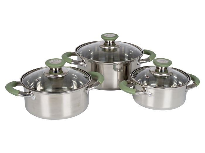 Sind Sie auf der Suche nach Töpfen, die gut auf Ihren kompakten Herd passen? Diese Töpfe haben die perfekte Größe, um sie nebeneinander auf einem 3-flammigen Kocher zu verwenden. Dieses Set besteht aus 3 verschieden Töpfen mit einem zugehörigen Glasdeckel für jeden Topf. So können Sie genau verfolgen, was in dem Topf passiert. Dank der Silikonbeschichtung sind die Griffe an den Töpfen und an den Deckeln hitzebeständig.