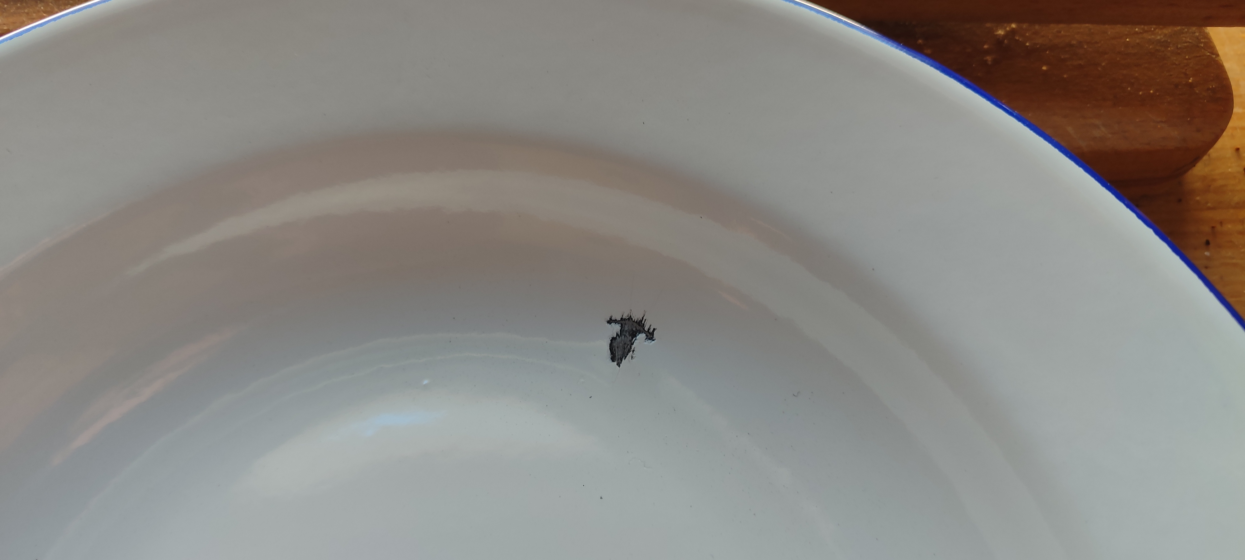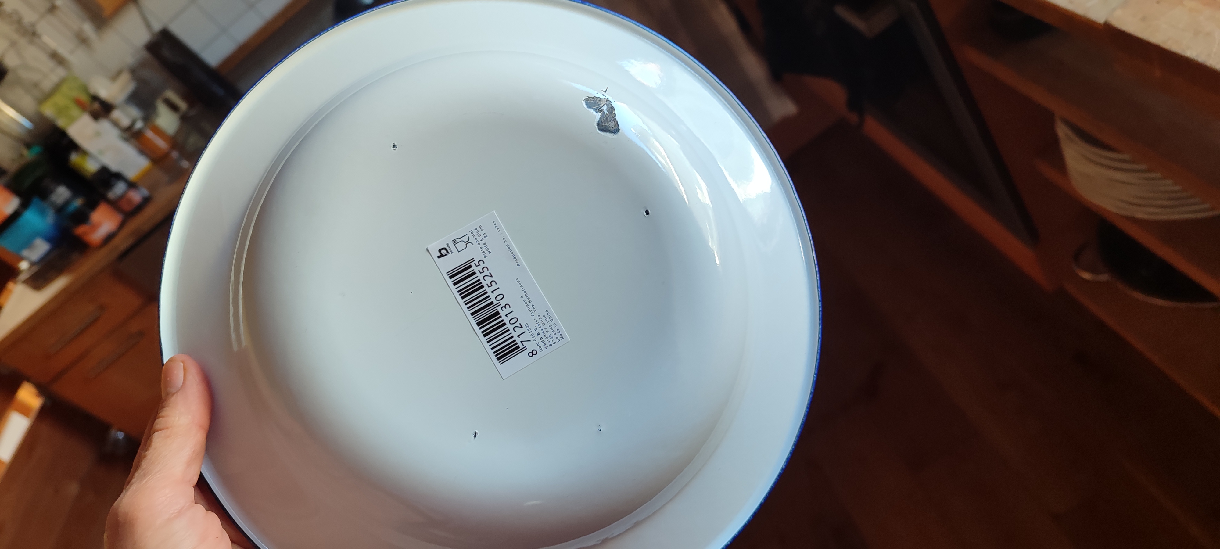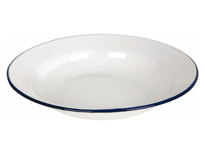 Der Bo-Camp Emaille Teller hat einen Durchmesser von 24 cm und ist mit einem blauen Rand verziert. Emaille ist hitzebeständig und langlebig und bietet zusätzliche Hygiene, Schutz und Qualität.