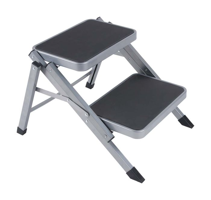 Extra stabiler Tritt mit doppelten Stufen. Mit einem Stahlrahmen mit Anti-Rutsch-Beschichtung. Nach dem Gebrauch kann sehr kompakt und flach gefaltet werden. Tiefe der Schritt: 26 cm. Maximale Belastung: 150 Kilogramm.