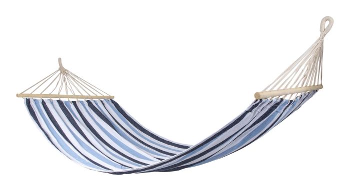 Eine fröhliche und robuste Hängematte. Entspannen Sie im Urlaub, im Garten oder auf dem Balkon. Aus robuster 320gr/m² Baumwolle/Polyester. Die Hängematte hat an den Enden eine Spreizstange von 100 cm, damit der Stoff komplett offen bleibt.