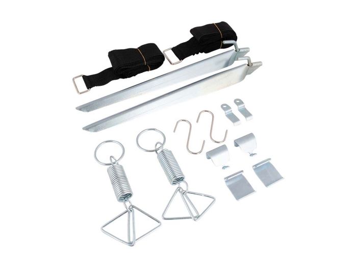 Ein universelles Sturmgurt-Set sowohl für Kassetten- als auch für Taschenvorzelte. Passt für alle Markisen aller bekannten Marken. Das Set besteht aus 2 Nylongurten, 2 Federn, 2 Sturmhaken und 6 Stahlhaken (2x 1,5 cm, 2x 2,5 cm und 2x 3,5 cm).