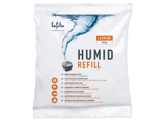 Lafita vochtvangers worden in Nederland geproduceerd en absorberen overtollig vocht in de ruimte. Eén navulling gaat ongeveer 1-3 maanden mee en past in iedere vochtvanger. Deze navullingen hebben een frisse jasmijn geur. Verpakking van 24 stuks.