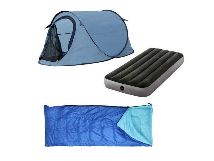 - Komplettpaket aus Pop-up-Zelt mit Heringen, Schlafsack und Luftbett
