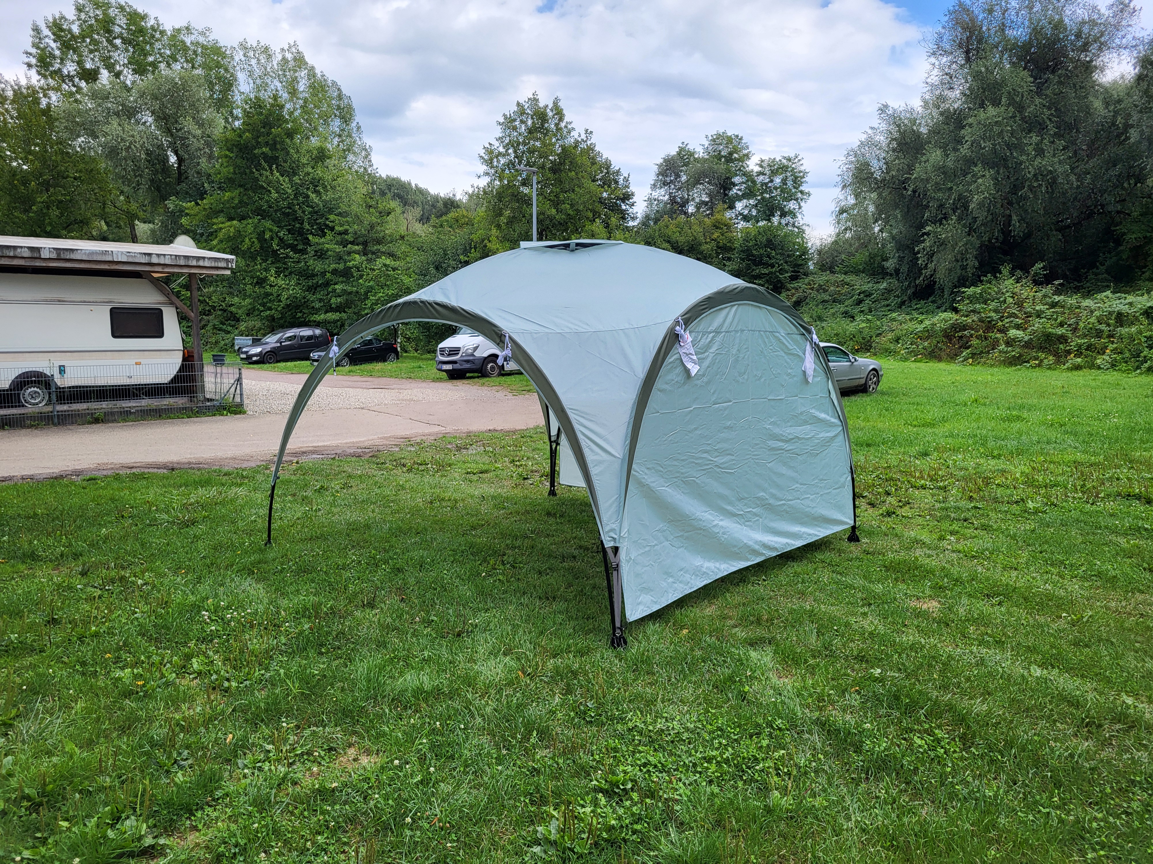 Eine blickdichte Seitenwand, die für das Coleman Event Shelter M geeignet ist. Diese hellgraue Seitenwand kann einfach mit einem Klettverschluss an dem Gerüst des Event Shelter befestigt werden.