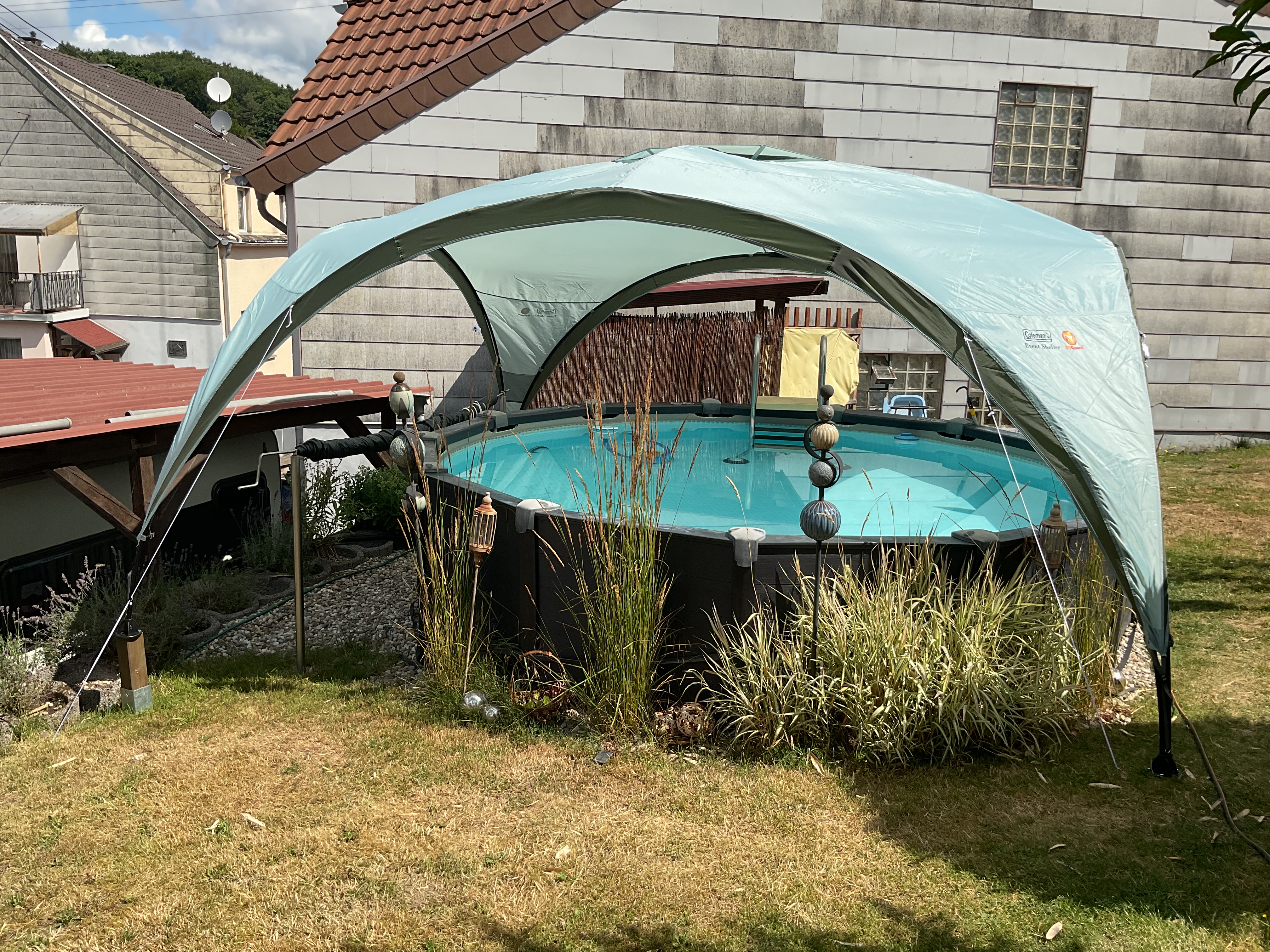 Das Partyzelt bietet ausreichend Platz für einen Tisch mit Stühlen, sodass Sie geschützt essen oder feiern können.