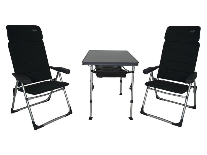 Das kompakte Set 213 CTA, bestehend aus einem höhenverstellbaren Tisch mit Ablagenetz, dazu passenden Stühlen und einer robusten Aufbewahrungstasche ist perfekt für kleinere Wohnmobile und Camper geeignet. Der luxuriöse Campingtisch AL-246 ist mit einer hitzebeständigen, wasserfesten Tischplatte aus Melamin und einem robusten Aluminiumrahmen mit Pulverbeschichtung ausgestattet. Er verfügt über stufenlos verstellbare Beine (59-76 cm), die per Schnellverschluss fixiert werden können. Die selbstnivellierenden Stabilisierungsfüße sorgen jederzeit für optimalen Halt, auch bei unebenem Terrain. Mit einem Handgriff können die Beine unkompliziert eingeklappt werden, wodurch sich der Tisch komfortabel und mit nur 4 cm Dicke sehr platzsparend transportieren lässt. Das große Netz unter dem Tisch ist ideal zum Verstauen von Zeitungen, Zeitschriften, dem Telefon oder anderen Accessoires.