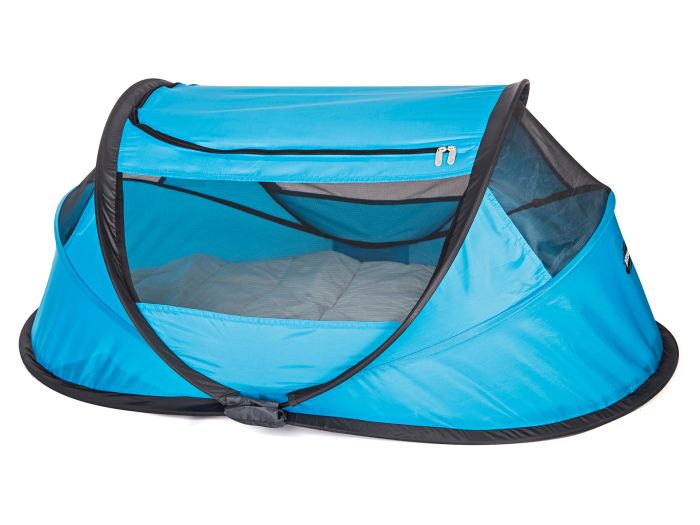 Die Deryan Baby Box in der Farbe blau ist ein kompaktes Wurfzelt-Reisebett, geeignet für Kinder von 0 bis 2,5 Jahren