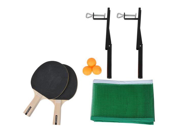Dieses Dunlop-Set ist für zwei Personen geeignet und besteht aus zwei Schlägern, drei Bällen, einem Netz und einer Tischhalterung. Das Set wird in einer praktischen Aufbewahrungstasche geliefert.