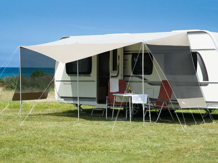 Die beeindruckende Dachtiefe von 240 cm bietet großzügigen Raum am Wohnwagen, perfekt für Camper, die Wert auf Komfort legen. Die leicht einstellbaren Seitenteile können senkrecht oder schräg ausgerichtet werden, um den individuellen Platzbedarf perfekt zu decken.