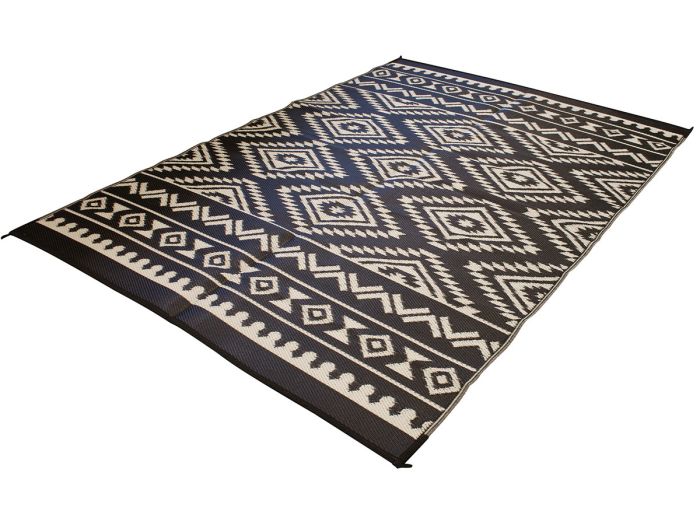 Die Patio Matte Relax ist beidseitig verwendbar, sodass Sie zwischen einem hellen und einem dunklen Design wählen können. Der Zeltteppich ist rundherum mit einem Band eingefasst und hat an den Ecken Schlaufen, mit denen Sie die Matte mit einem Hering befestigen können.