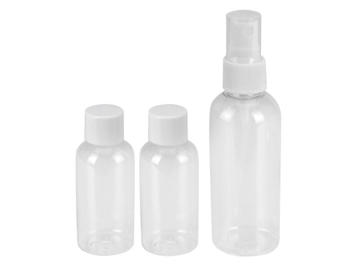 Das Excellent Houseware Reiseset besteht aus 2 Flaschen mit einem Inhalt von 40ml und einem Zerstäuber mit 80ml Inhalt.