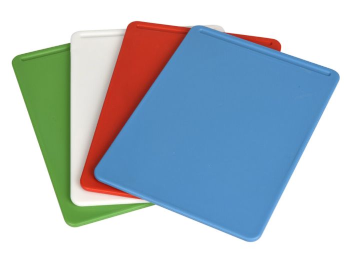 Für hygienisches Arbeiten in der Küche werden verschiedene Schneidebretter empfohlen. Sie verwenden das rote Schneidebrett für rohes Fleisch, das blaue Schneidebrett für Fisch und Meeresfrüchte, das grüne Schneidebrett für Obst und Gemüse und das weiße Schneidebrett für Käse und Brot. Die Schneidebretter sind spülmaschinenfest und können in der Spülmachine bis zu zwei Stunden lang eine Temperatur von 70 Grad halten.