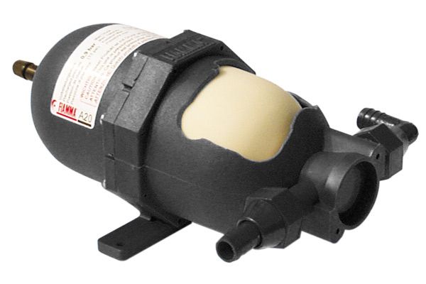 Die Innenmembran absorbiert Stöße und ermöglicht einen gleichmäßigen Wasserdurchfluss. Das Fiamma-Ausdehnungsgefäß ist auf 0,9 bar (13 psi) voreingestellt, kann aber mit einem normalen Kompressor am Ventil eingestellt werden, sodass es sich für alle selbstansaugenden Pumpen eignet.