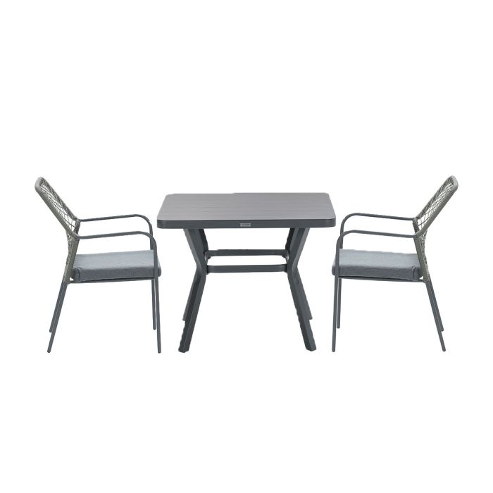 Der Gartenstuhl hat die Maße 63 x 55 cm und ist 85 cm groß. Der Gartentisch hat eine dunkelgraue Farbe und ist 90 x 90 und 71 cm hoch.