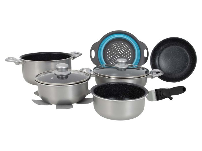 Ein 9-teiliges silbernes Pfannenset. Hervorragend geeignet für Induktionskochfelder. Ideal für den Wohnwagen, Wohnmobil, sondern auch zu Hause. Dieses Set besteht aus: 4 Stieltöpfe Ø 24 cm - 4 L, Ø 23,5 cm - 2,2 L, Ø 19,5 cm - 1,7 L, Ø 18 cm, 1,3 L. Pfanne Ø 21,5 cm. 2x Deckel Ø 23,5 cm und Ø 19,5 cm. Außerdem ist dieses Set mit einem Sicherheitsgriff mit Sperrfunktion und einem Klappsieb ausgestattet. Inklusive 3 Topfschützer aus Filz.