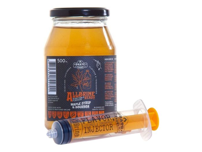 Diese AllBrine Maple Syrup & Bourbon ist eine Mischung aus Salzlake, Wasser und köstlichen Kräutern und kann mit der mitgelieferten Marinierspritze in das Fleisch gespritzt werden, um es zarter und schmackhafter zu machen. Diese Lake hat einen kräftigen, süßen Geschmack mit einer interessanten Geschmackskombination aus süßem, holzigem Ahornsirup und kräftigem, eichengereiftem Bourdon. Perfekt in Kombination mit Rind, Lamm, Huhn, Schwein und Fisch.
