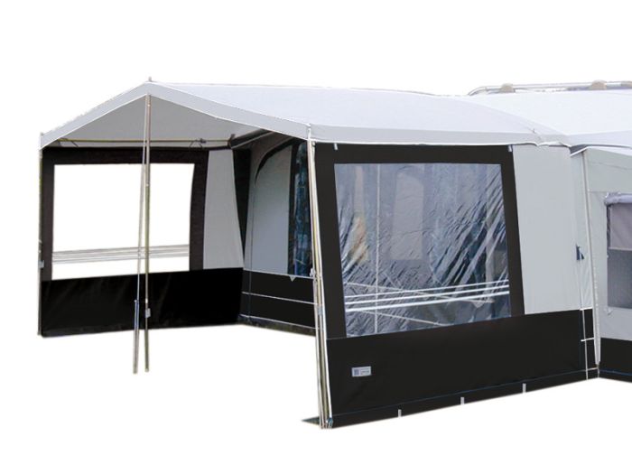 Das Hypercamp TC Vorzeltvordach niedrig Größe 13 hat eine Tiefe von 200 cm und eignet sich für Vorzelte mit einem A-B Maß von 261 bis 271 cm. Dank der niedrigen Seitenwände ist es für die Dorema, Gerjak und Hypercamp Vorzelte von vor 2010 geeignet.