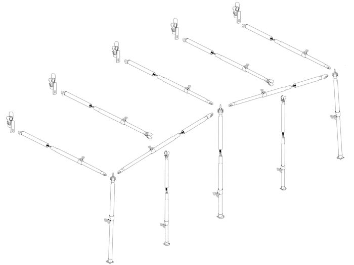 Das Gestänge hat einen Durchmesser von 32 mm und beinhaltet fünf Ständer und fünf Dachträger. Mit den mitgelieferten F-Gliedern können Sie das Vordachgestänge mit dem Vorzeltgestänge Ihres Isabella oder Ventura Vorzeltes verbinden.