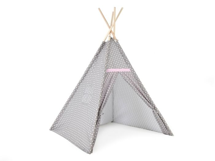 Dieses Tipi-Zelt besteht aus unbeschichtetem Material und ist daher nicht wasserdicht. Die blaue und graue Variante sind aus Polyester und die rosafarbenen und anthrazitfarbenen Varianten sind aus Baumwolle gefertigt.