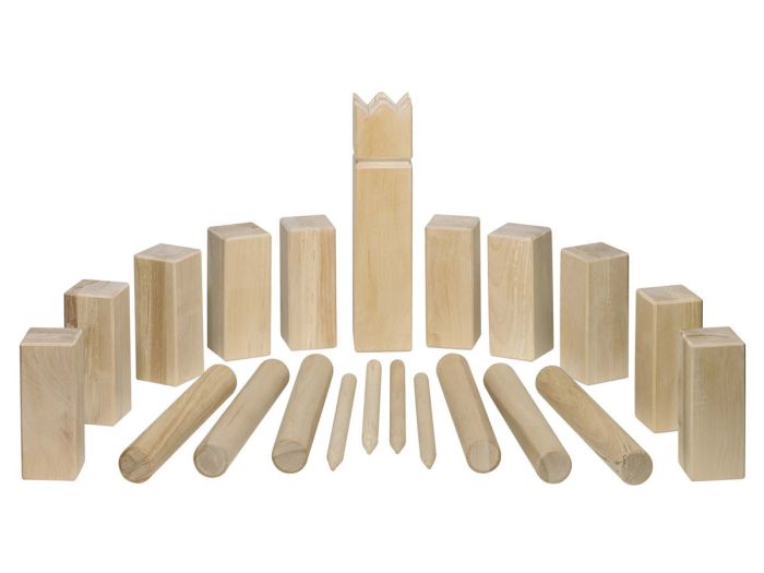 Inhalt: 1x König, 10x Holzklötze (Kubbs), 6x Wurfstab und 4x Eckstab.