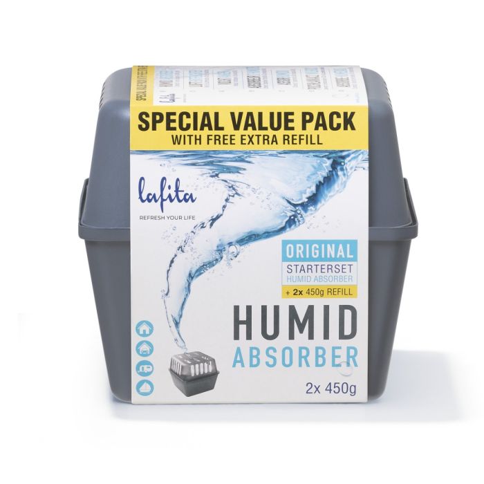 Lafita vochtvangers worden in Nederland geproduceerd en absorberen overtollig vocht in de ruimte. De stevige en compacte opvangbak heeft een simpel en strak design. De vochtvangers zijn eenvoudig navulbaar en een navulling gaat ongeveer 1-3 maanden mee. Deze voordeelverpakking bevat een gratis extra navulling.