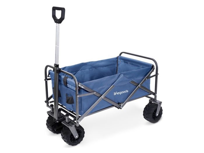 Mit dem Bollerwagen von LifeGoods transportieren Sie mühelos all Ihre Habseligkeiten während eines Tagesausflugs oder bei der Gartenarbeit. Dieser faltbare Wagen hat ein beeindruckendes Fassungsvermögen von 94 l und kann satte 80 kg tragen. Dank seiner großen, geländegängigen Räder und des robusten, doppellagigen Polyesters wird dieser Wagen Ihr treuer Begleiter bei jeder Arbeit sein, ob drinnen oder draußen. Zusammenfalten? Überhaupt kein Problem!