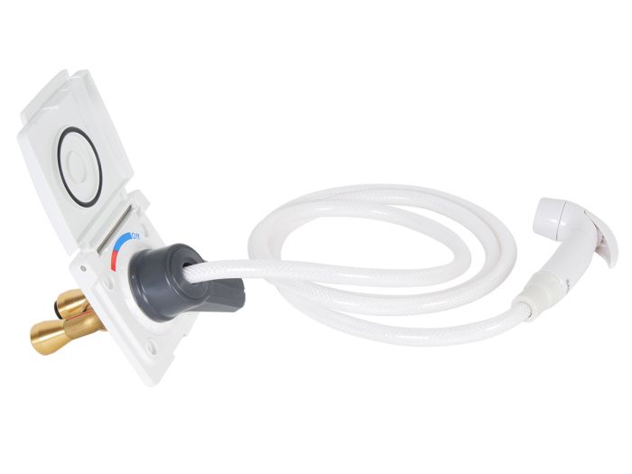 Das Lilie Außendusche-Set in der Farbe Weiß wird mit einem Außenduschanschluss geliefert, komplett mit Steckdose, Schlauch und Duschkopf. Der Anschluss ist sowohl für warmes als auch kaltes Wasser geeignet.