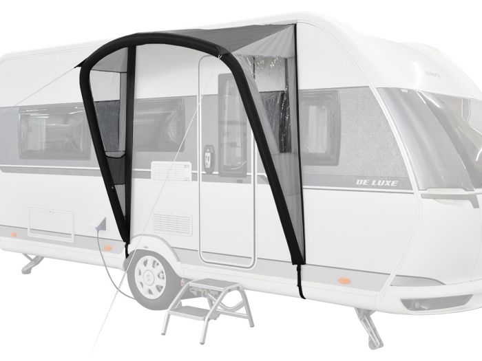 Mit einer Türmarkise am Wohnwagen können Sie die Wohnwagentür zur Belüftung aufstellen, ohne dass Regen eindringt. Eine Türmarkise bietet außerdem mehr Privatsphäre und bietet ein zusätzliches Campinggefühl, wenn Sie mit Ihrem Wohnwagen ohne Vorzelt unterwegs sind. An beiden Seitenwänden befindet sich ein praktisches Staufach für Ihre Schuhe. So können Sie mit sauberen und trockenen Füßen den Wohnwagen betreten.