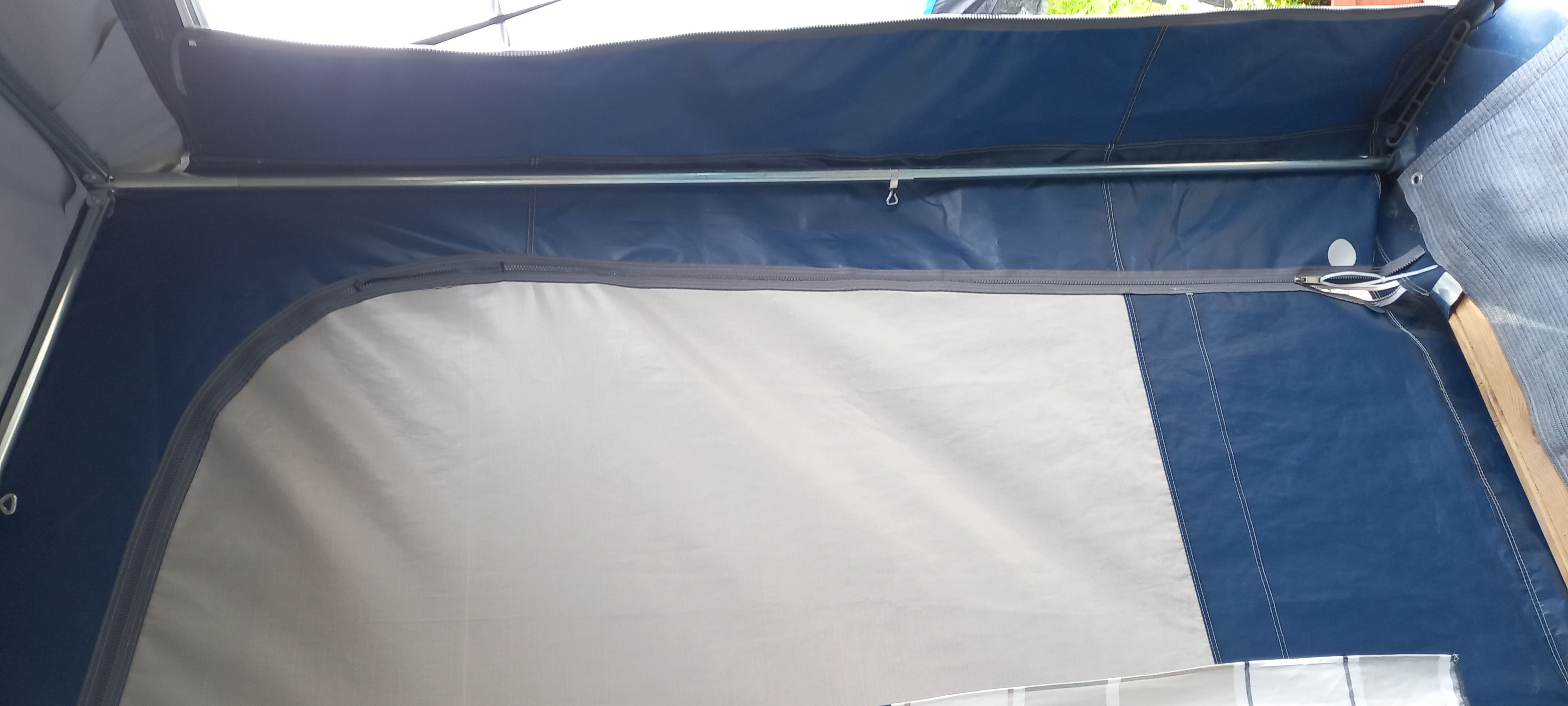Eine Schnur am Keder zur Befestigung von (optionalen) Clips, in die Sie Dachbalken einhaken können. Dank dieser Schnur müssen Sie keine Ösen an die Wohnwagenwand schrauben, um Dachbalken zu verwenden.