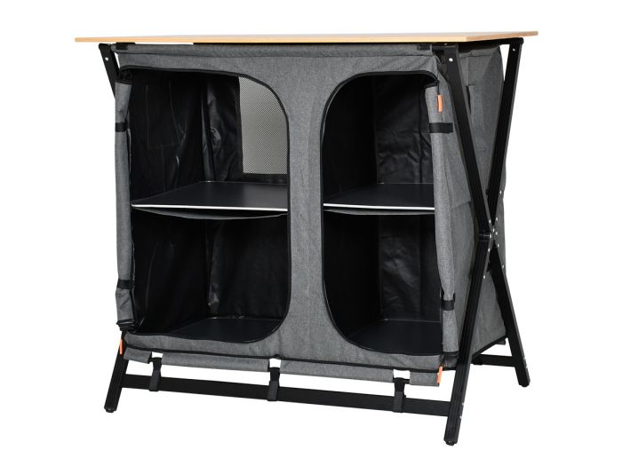Der Schrank verfügt über vier geräumige Ablagefächer, in denen Sie Kleidung, Kochutensilien oder andere Campingausrüstung ordentlich aufbewahren können. An der Seite finden Sie eine praktische Seitentasche für kleinere Gegenstände, die Sie schnell zur Hand haben möchten. Die Rückseite ist mit einem Belüftungsnetz versehen, damit Ihre Sachen frisch bleiben.