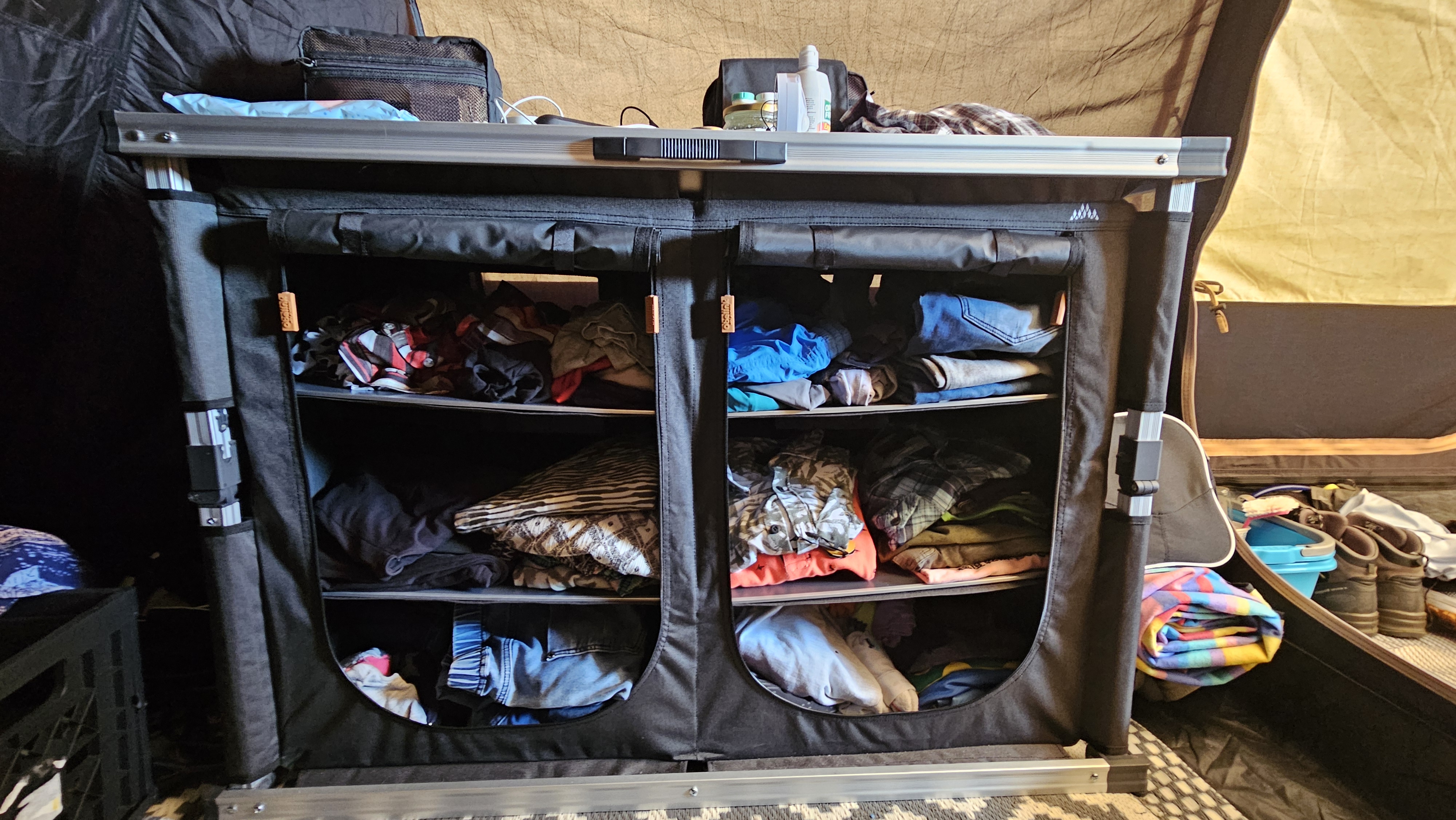 Dieser Campingschrank verfügt über sechs geräumige Staufächer, in denen Sie Ihre Campingausrüstung wegräumen können. Die Rückseite ist für eine optimale Belüftung mit einem Gittergewebe (Mesh) versehen.