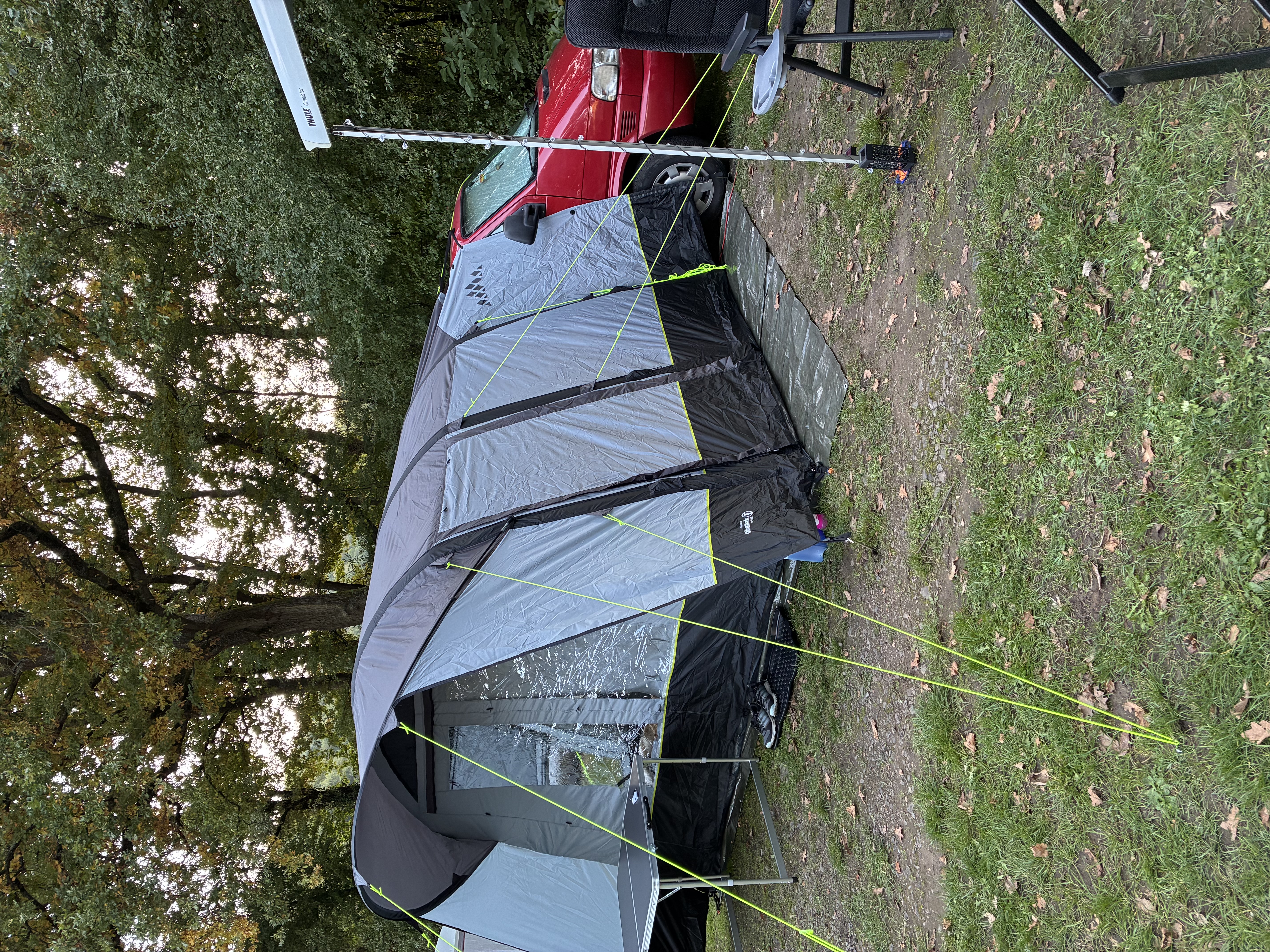 Der (überdachte) Raum zwischen dem Zelt und dem Fahrzeug.