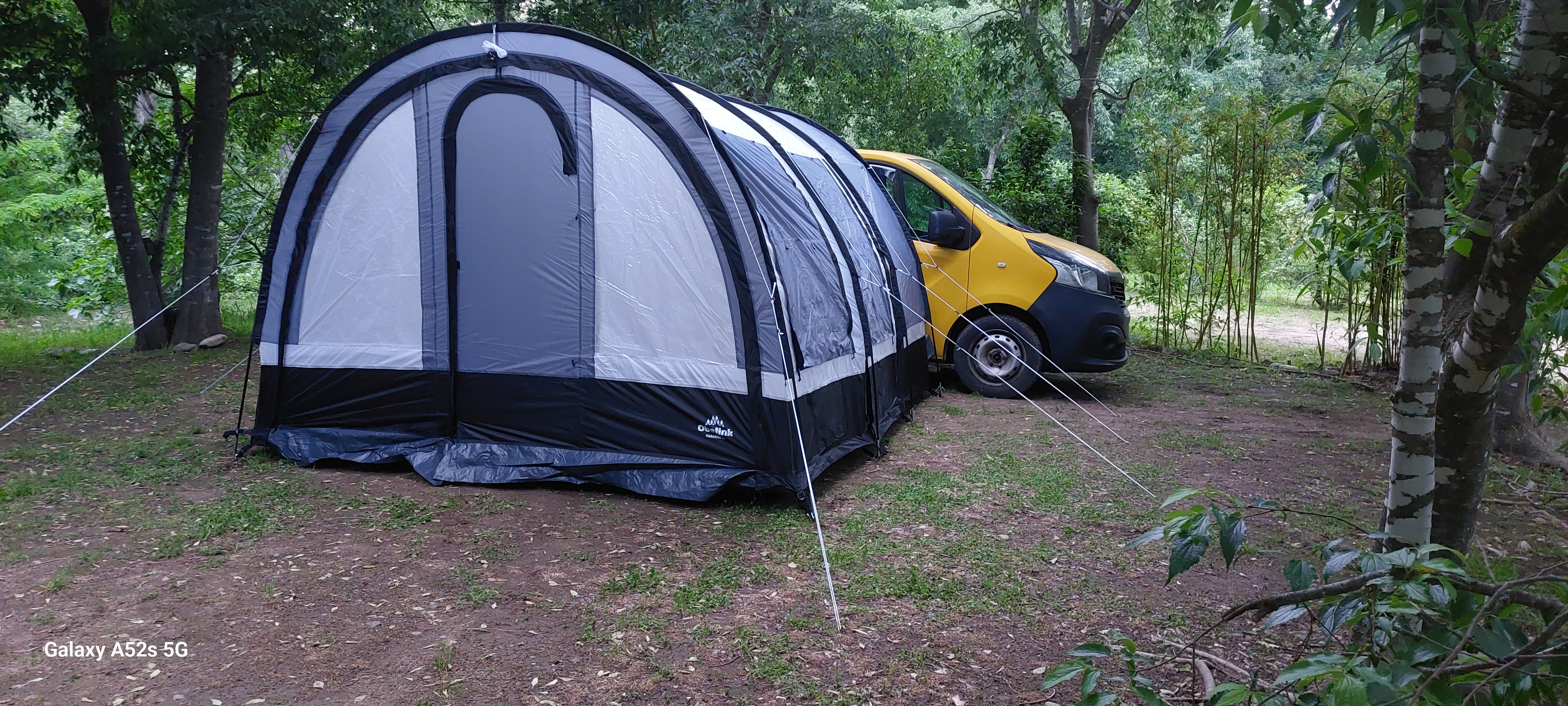 Der (überdachte) Raum zwischen dem Zelt und dem Fahrzeug.