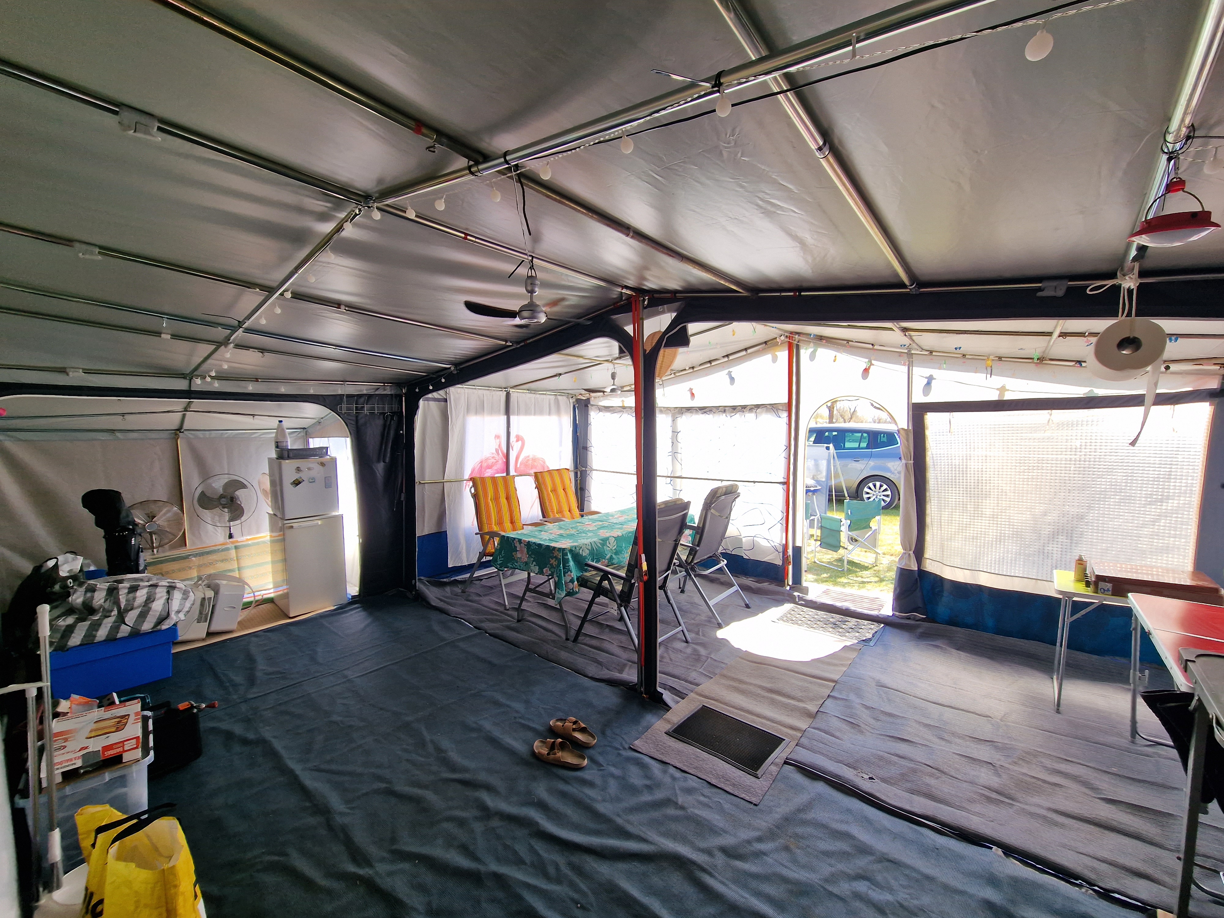 Die linke Seitenwand, wenn man das Zelt von vorne betrachtet.