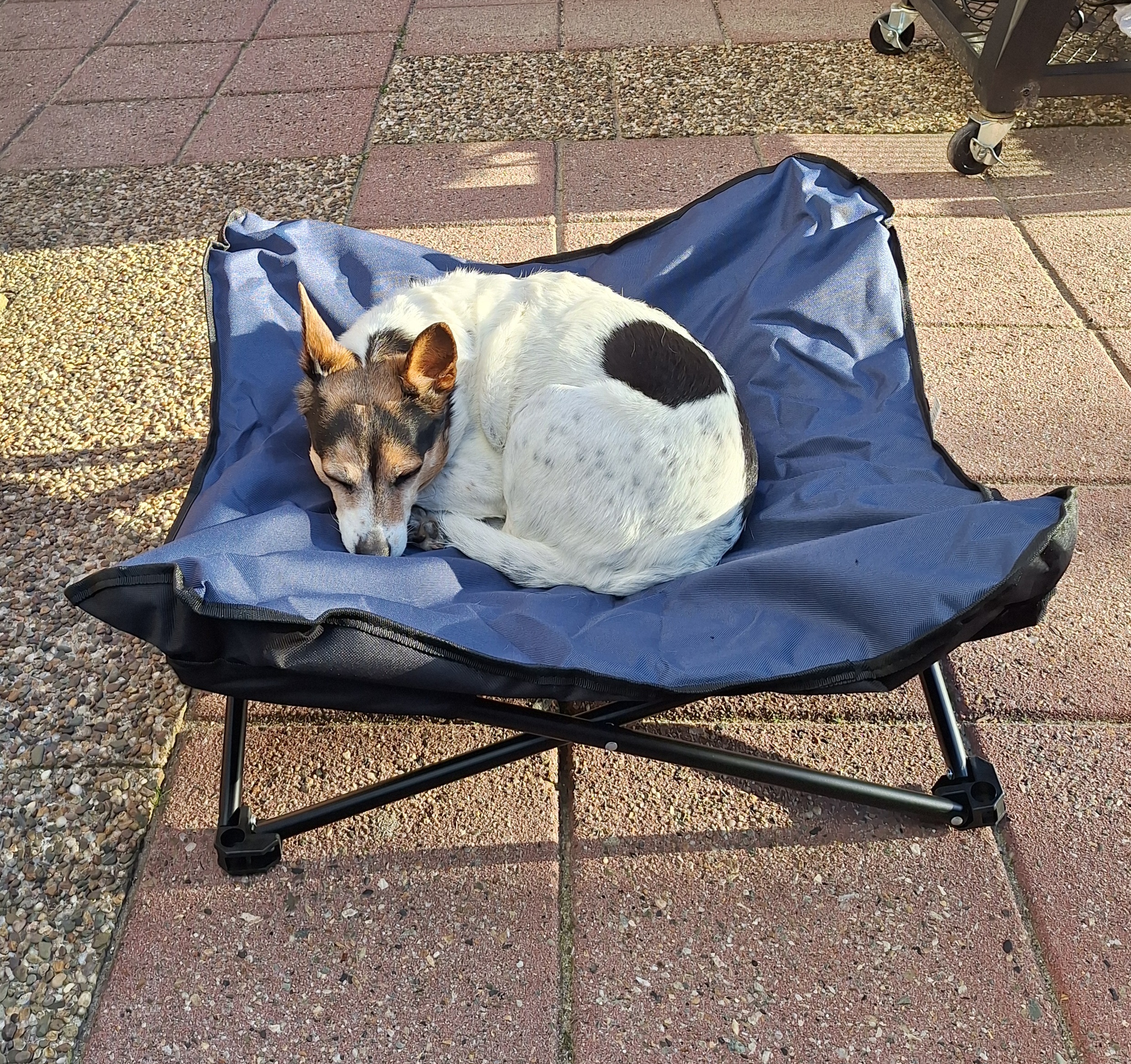 - Goed afgewerkt en handigStevig en handig klapstoeltje voor de hond. De poten van het onderstel hebben ieder een gat waarin je een haring kunt slaan, zodat de stoel blijft staan. De hoeken van het doek van de zitting hebben klittenband, dit maak je vast als de zitting over het onderstel getrokken is. Op die manier gaat de zitting er niet bij een windvlaag vandoor. Naden lijken stevig, een en ander is netjes afgewerkt. Onderstel lijkt stevig genoeg. Eenvoudig in te klappen en makkelijk te vervoeren in de bijgeleverde hoes.