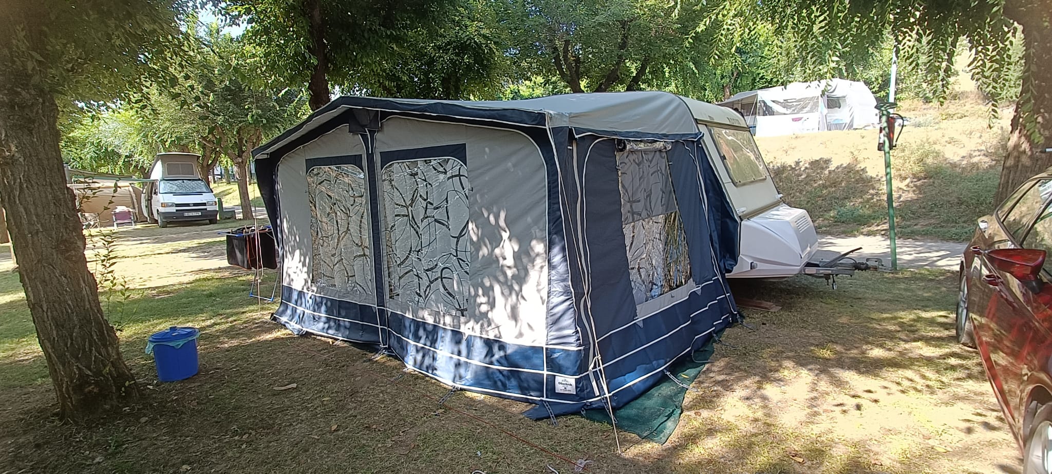 Ein Dachüberstand, der bei den meisten traditionellen Wohnwagenvorzelten erhalten ist.