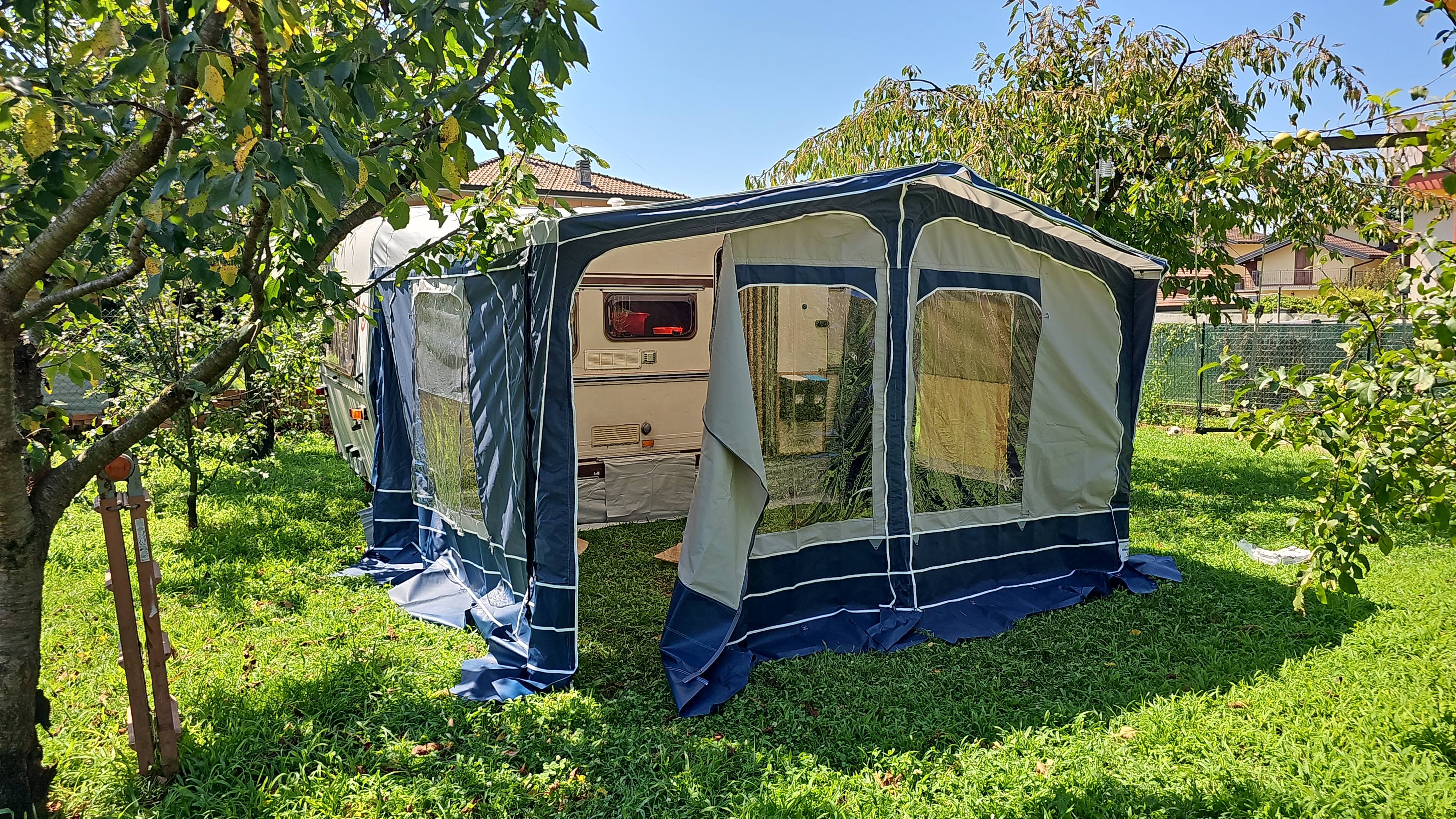 Ein Dachüberstand, der bei den meisten traditionellen Wohnwagenvorzelten erhalten ist.