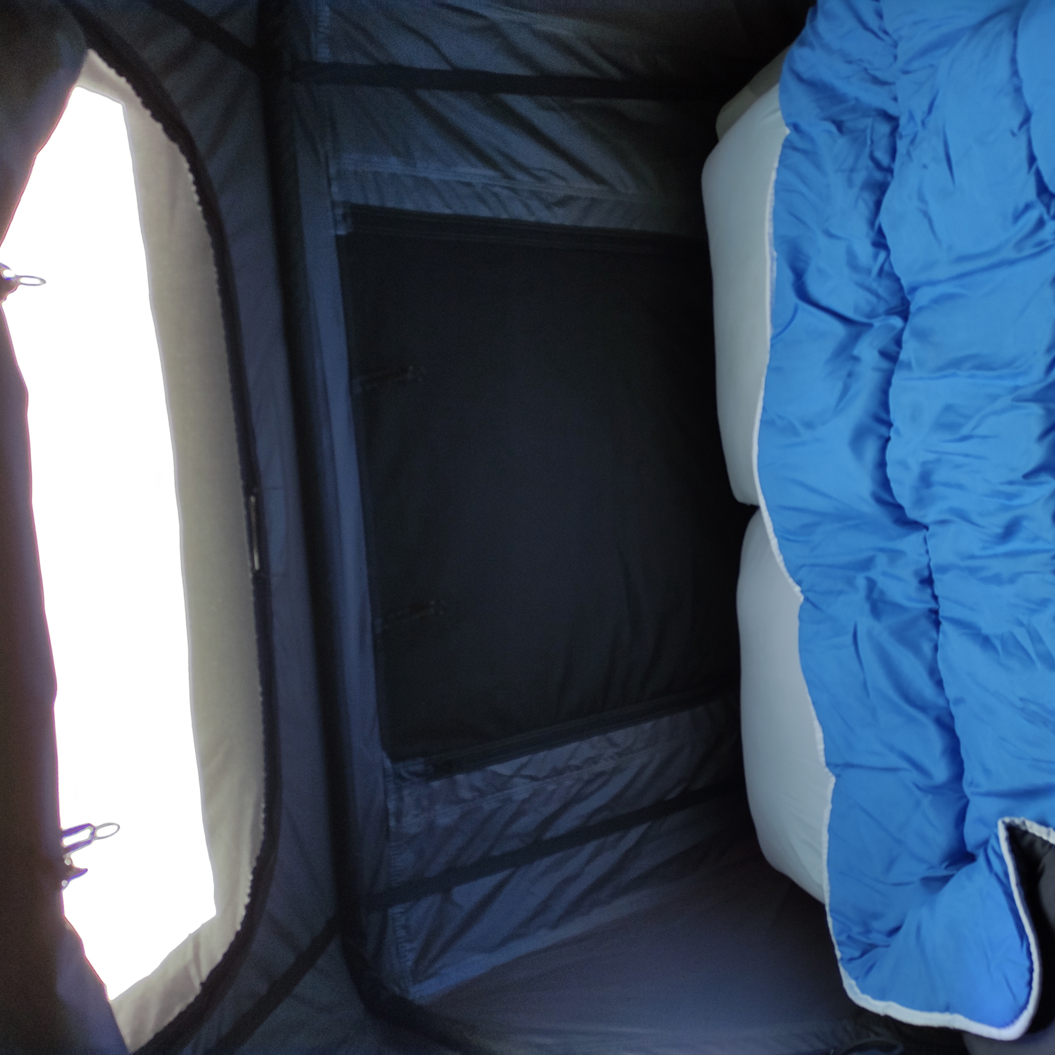 Das Skyfold 140 Short ist ein robustes Qualitätszelt mit einem leichten Aluminiumgestell. Sie entfernen die Abdeckung des Zeltes, klappen das Zelt auf und schon können Sie campen. Das Skyfold ist rundum mit vielen Belüftungsöffnungen mit Abdeckklappen versehen, die dank der mitgelieferten Spannstangen wie Markisen ausgefahren werden können. So kann das Zelt bei jedem Wetter gut belüftet werden. Über die integrierte Aluminiumleiter gelangen Sie ins Dachzelt. Das Skyfold ist mit einer bequemen, 6 cm dicken Matratze ausgestattet, auf der es sich herrlich schlafen lässt. Das Dachzelt hat zudem praktische Schuhaufbewahrungsfächer - damit das Zelt sauber bleibt - und einen integrierten LED-Streifen in Warmweiß - mit USB-Stecker. So kann das Zelt mit einer Powerbank (nicht im Lieferumfang enthalten) oder über einen 12-Volt-Stecker im Auto beleuchtet werden. Mit dem Dimmer kann die Intensität der Beleuchtung nach Wunsch eingestellt werden.