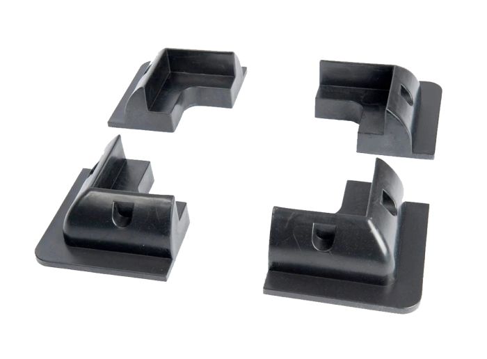 Die Eckstützen selbst müssen mit einer geeigneten Dichtungsmasse, wie z. B. Dekasyl MS-5 (nicht im Lieferumfang enthalten), auf das Dach geklebt werden. Das Kit enthält vier robuste ABS-Eckstützen, die eine stabile und zuverlässige Befestigung gewährleisten.