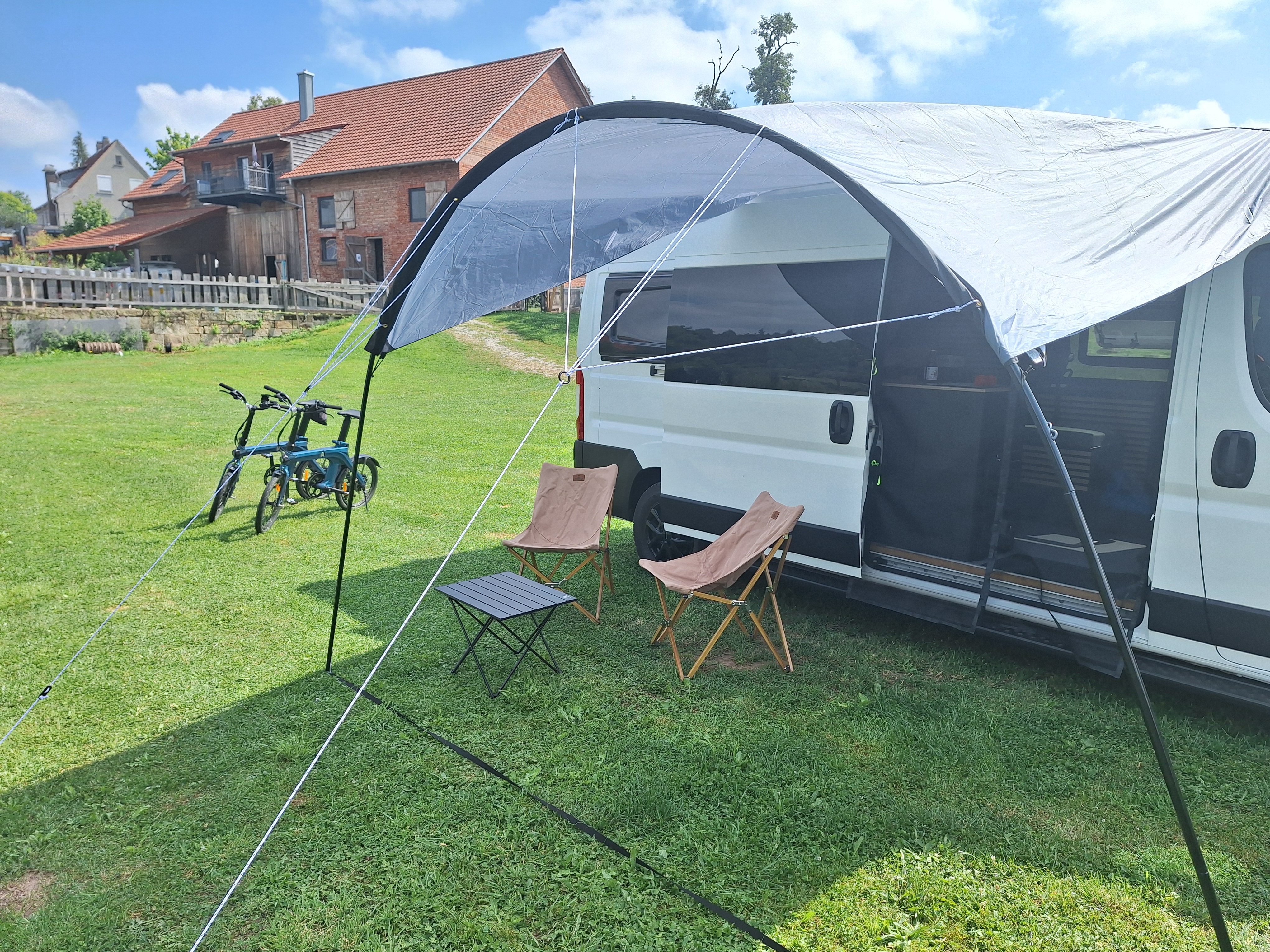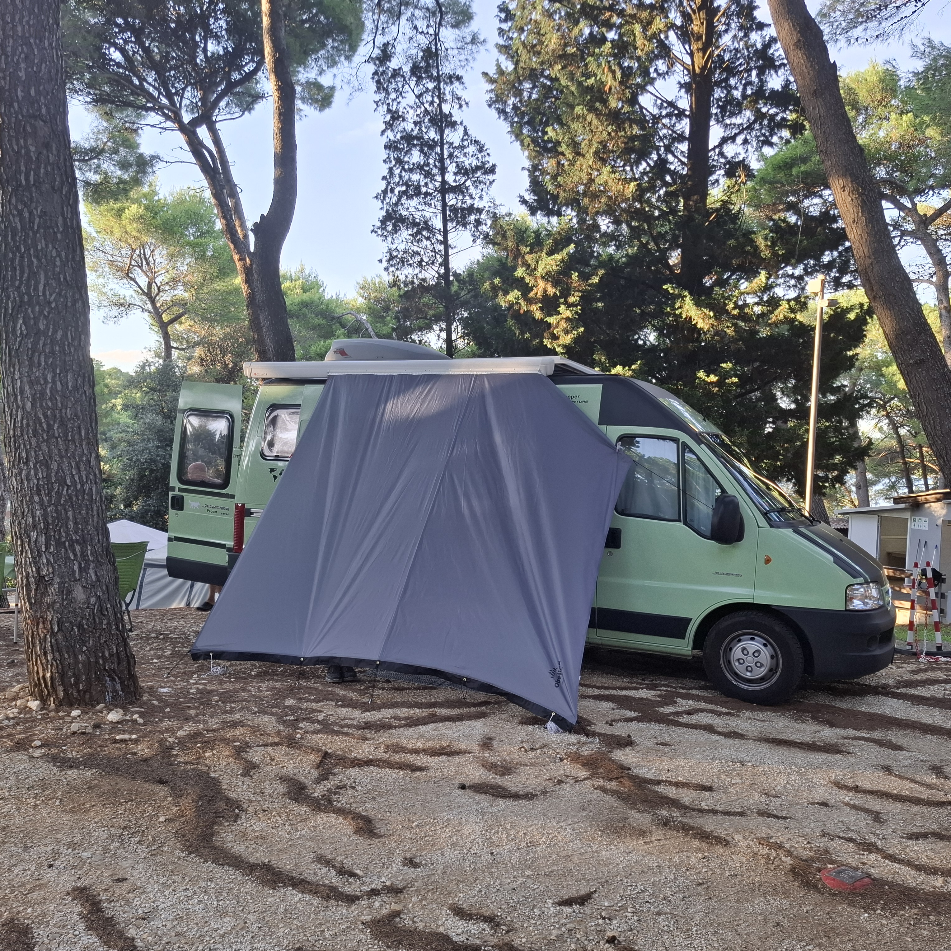 Ein Dachüberstand, der bei den meisten traditionellen Wohnwagenvorzelten erhalten ist.