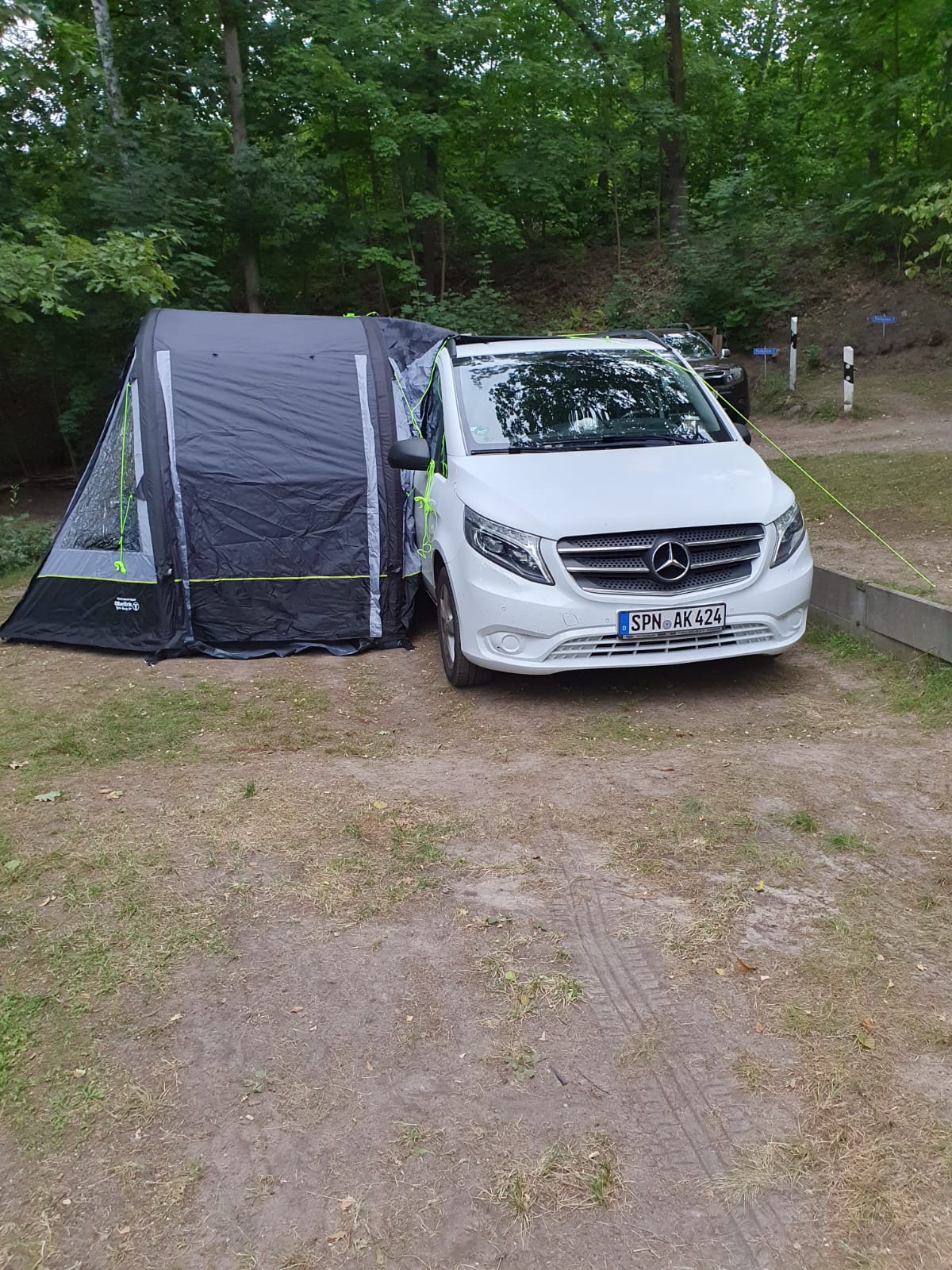 Der (überdachte) Raum zwischen dem Zelt und dem Fahrzeug.