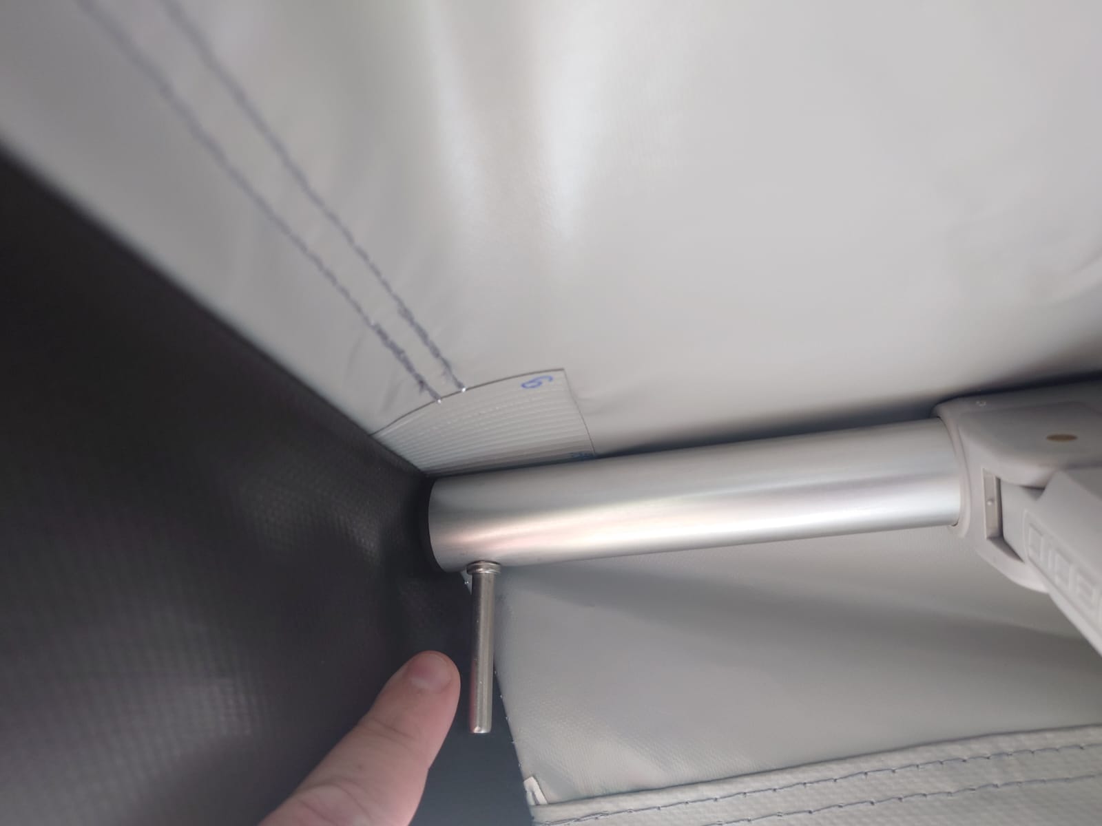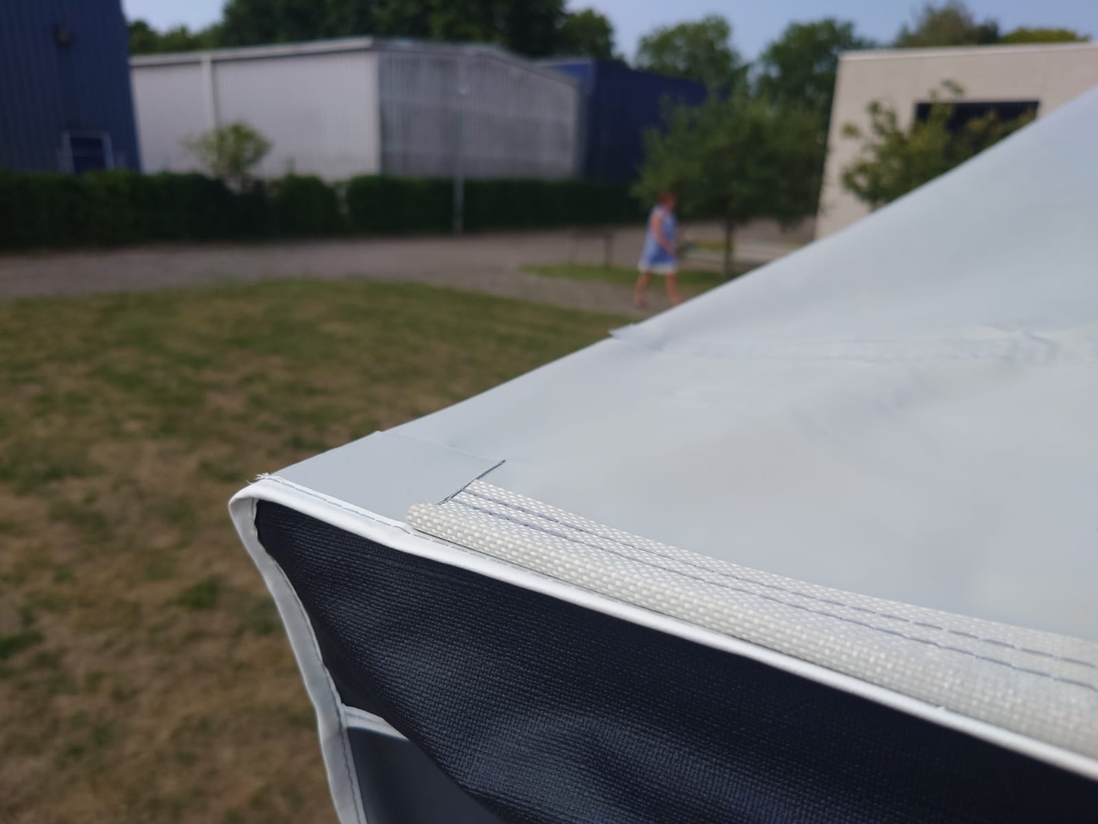 Eine Schnur am Keder zur Befestigung von (optionalen) Clips, in die Sie Dachbalken einhaken können. Dank dieser Schnur müssen Sie keine Ösen an die Wohnwagenwand schrauben, um Dachbalken zu verwenden.