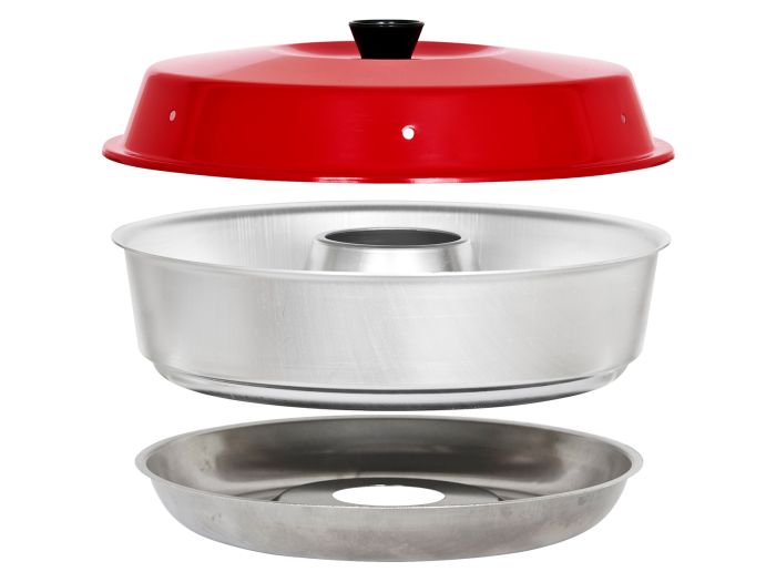 Die Pfanne besteht aus 3 Teilen, einem Edelstahlboden, einer Backform aus Aluminium und einem rot lackierten Deckel mit kleinen Dampfauslässen. Diese Teile werden immer zusammen verwendet und sorgen für eine Ober- und Unterhitze, genau wie bei einem normalen Ofen. Der Omnia kann auf allen Arten von Kochgeräten verwendet werden, mit Ausnahme eines Induktionsherds.