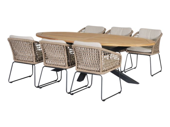 Sind Sie auf der Suche nach einem robusten ovalen Gartentisch mit stilvollen und bequemen Stühlen? Dann ist das Outdoor Feelings Kentucky Cleveland 240 Diningset - Sahara Dust genau das Richtige für Sie.