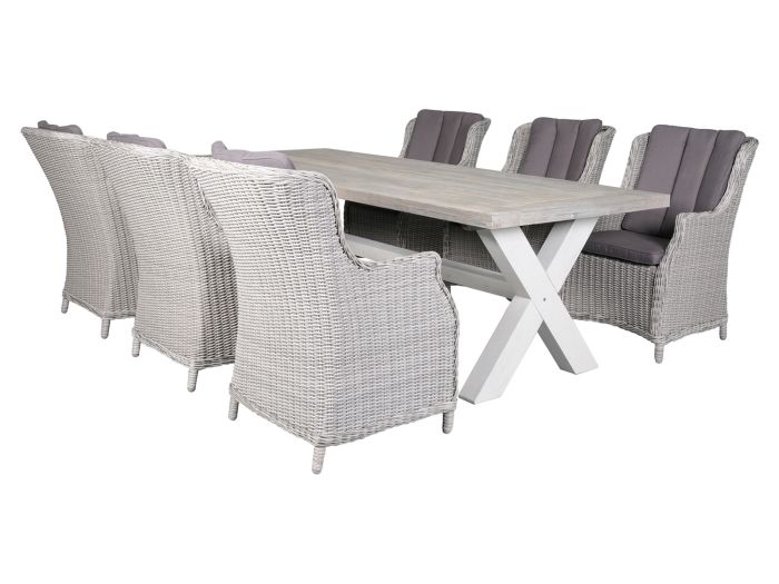 Dieses Set besteht aus sechs Diningstühlen und dem Tisch Sentral, der 250 x 100 cm groß ist. Die Tischplatte ist mit einem Greywash versehen. Dadurch hat der Tisch eine helle Farbe und einen schönen vergrauten Look.