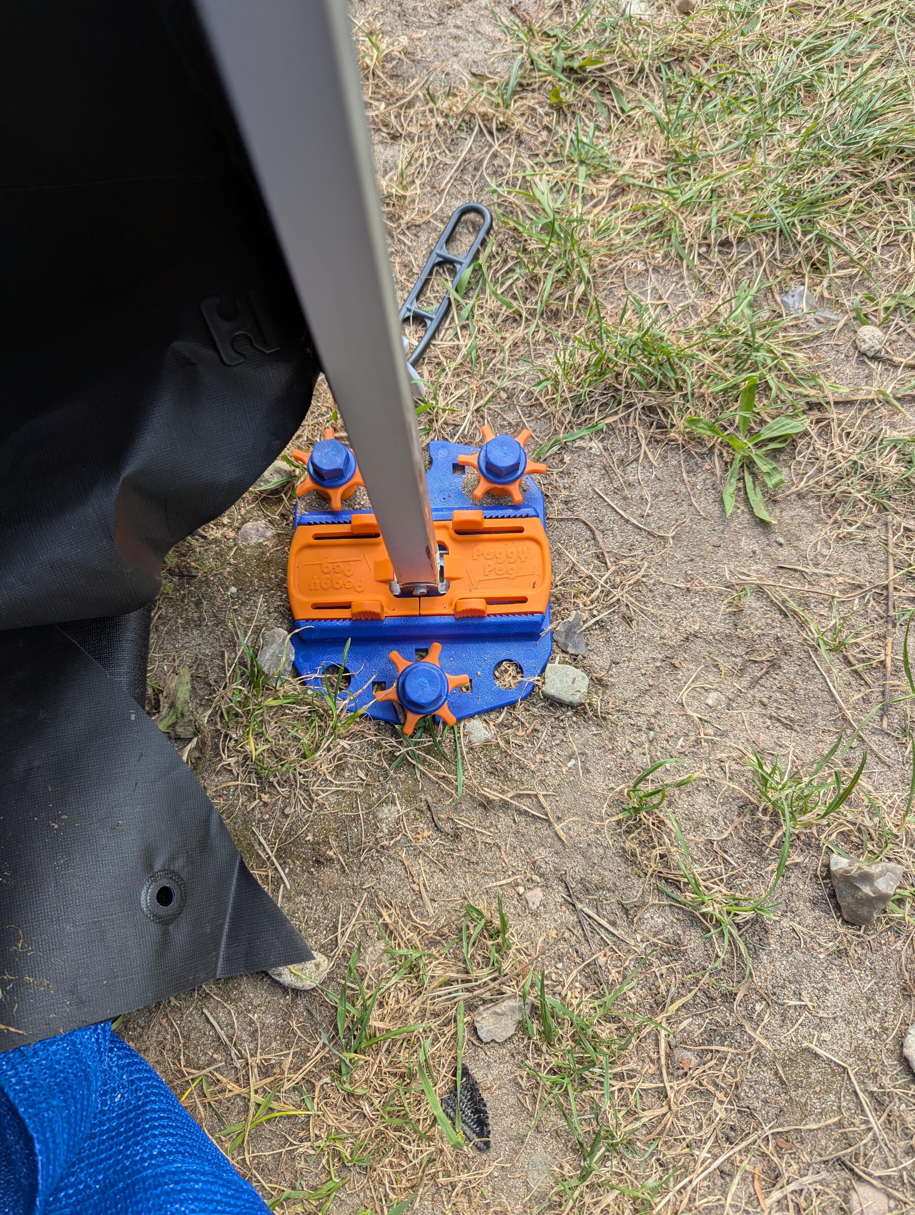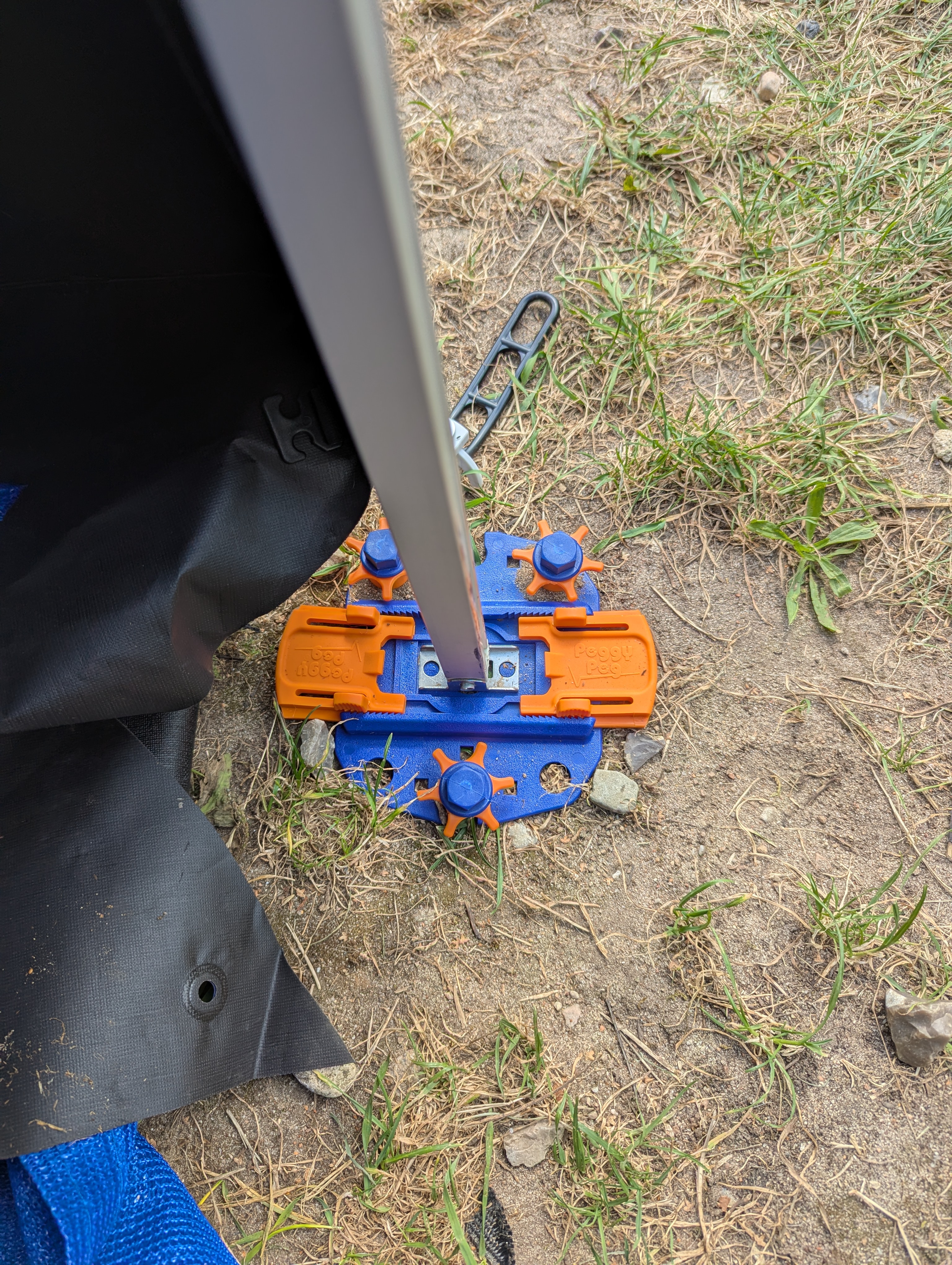 Wenn Sie die Heringe nicht vollständig in den Boden drehen können, können Sie die Ankerplatte trotzdem mit der orangefarbenen Muttern sichern. Sollte der Boden zu hart sein, gibt es einen praktischen Bohrer, mit dem Sie Löcher vorbohren können. Das Set wird mit einer Aufbewahrungstasche geliefert.